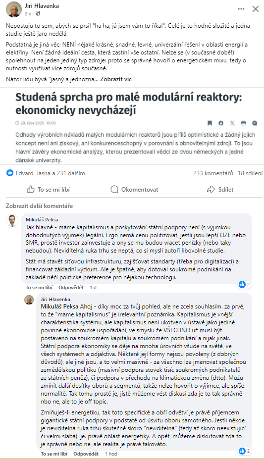 Jedním z těch, kdo argument použil byl i pirátský europoslanec Peksa. A že prý “zafunguje trh”. Jak ale vyplývá z jeho reakce pod příspěvkem pana Hlavenky na FB, tak nechápe základní souvislosti. A že energetika jako klíčové odvětví bylo, je a vždy bude výrazně ovlivňováno ze strany státu, bez ohledu jestli jsou “kapitalistický”.
