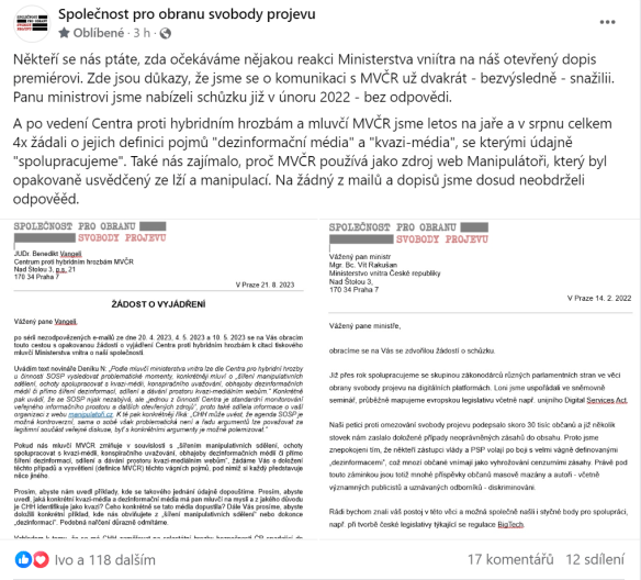 Níže příklad arogance Ministerstva vnitra, které nejdříve skrze své CHH nesmyslně obviňuje SOSP z různých vágně definovovaných “zločinů”, aniž by bylo ochotno toto nějak rozumně vysvětlit.